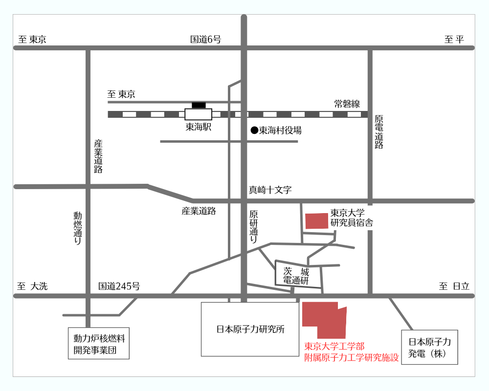 東海駅東口から「茨城東病院」または「海浜公園西口」行きで約10分、「原研前」で下車